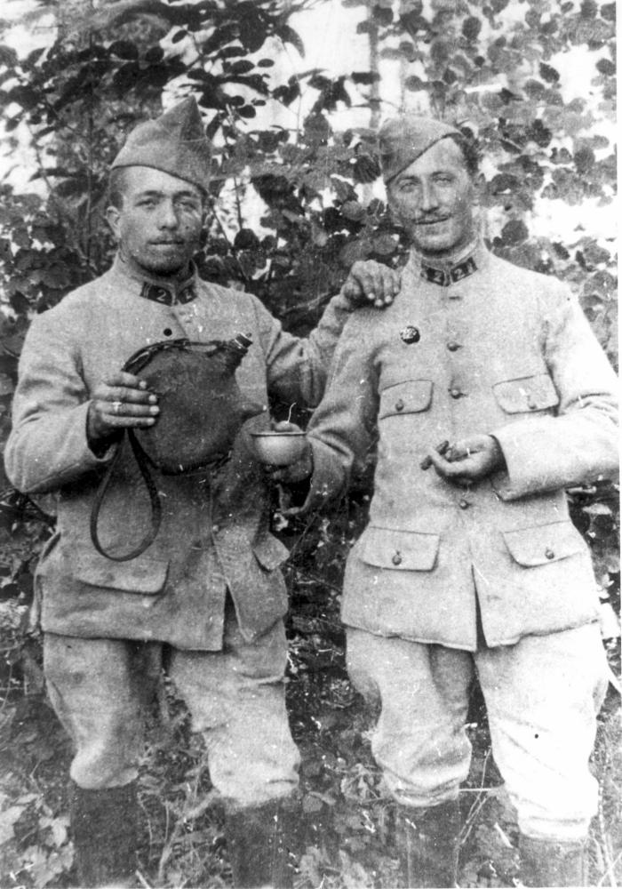 Photographie en noir et blanc de Henri COTTET et Henri GENOUD. Ils sont en tenue militaire et portent l'insigne 21 sur leur col.