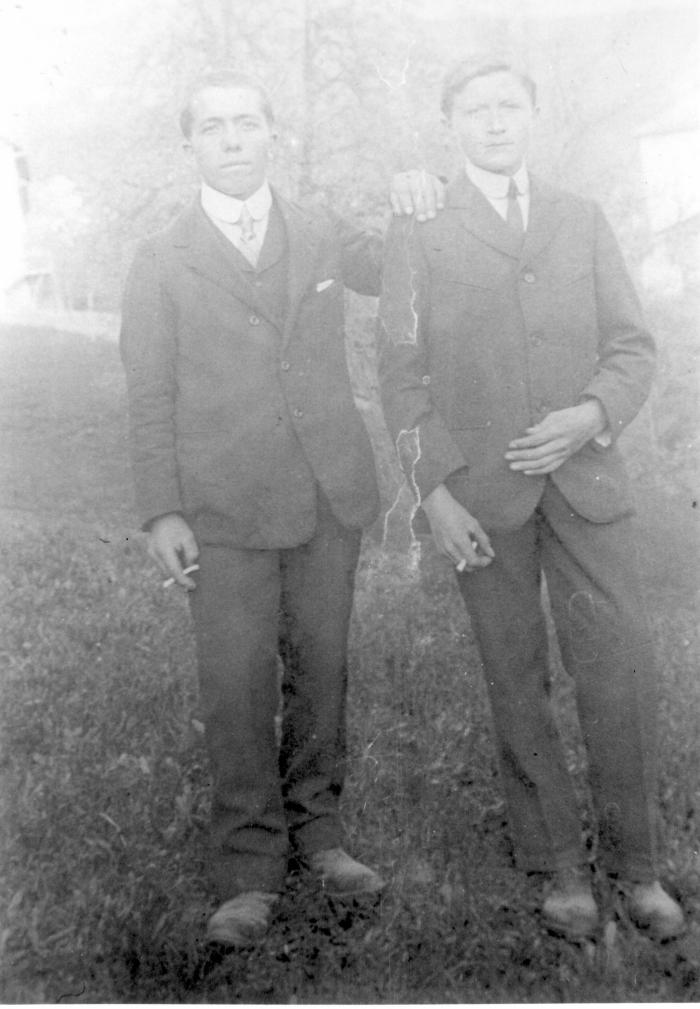 Photographie de Henri COTTET et Henri VACHAT. Ils portent chacun le costume et fument une cigarette. Travail de documentation réalisé par le GAER, Groupe d'Action pour l'Environnement Rural, la qualité de vie, l'animation à Habère Poche.