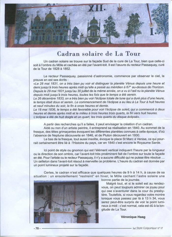 Article de HAAG Véronique décrivant le cadran solaire qui est situé sur la façade sud de la cure de La Tour. Cet article est tiré du Petit Colporteur N°17.
