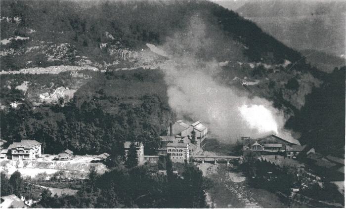 Photographie en noir et blanc représentant l'usine du Giffre. On aperçoit le pont qui traverse le Giffre. En arrière-plan le relief.