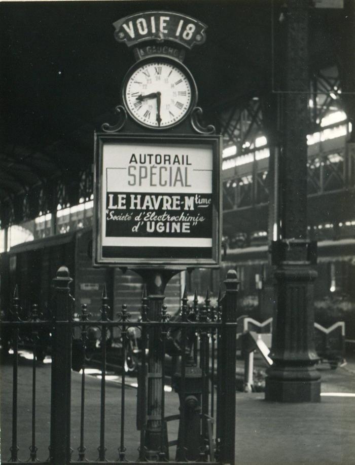 Panneau d'annonce de l'autorail dans le cadre du voyage des médaillés du travail de l'usine du Giffre à Paris.