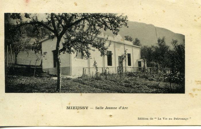 Carte postale représentant la salle Jeanne d'Arc à Mieussy, éditée par « la vie au patronage ». Ce bâtiment a été construit dans les années 1950 par l'association culturelle paroissiale de Mieussy. Il permettait des représentations, théâtrales, pour enfants, de chants. Il a été détruit dans les années 1990.