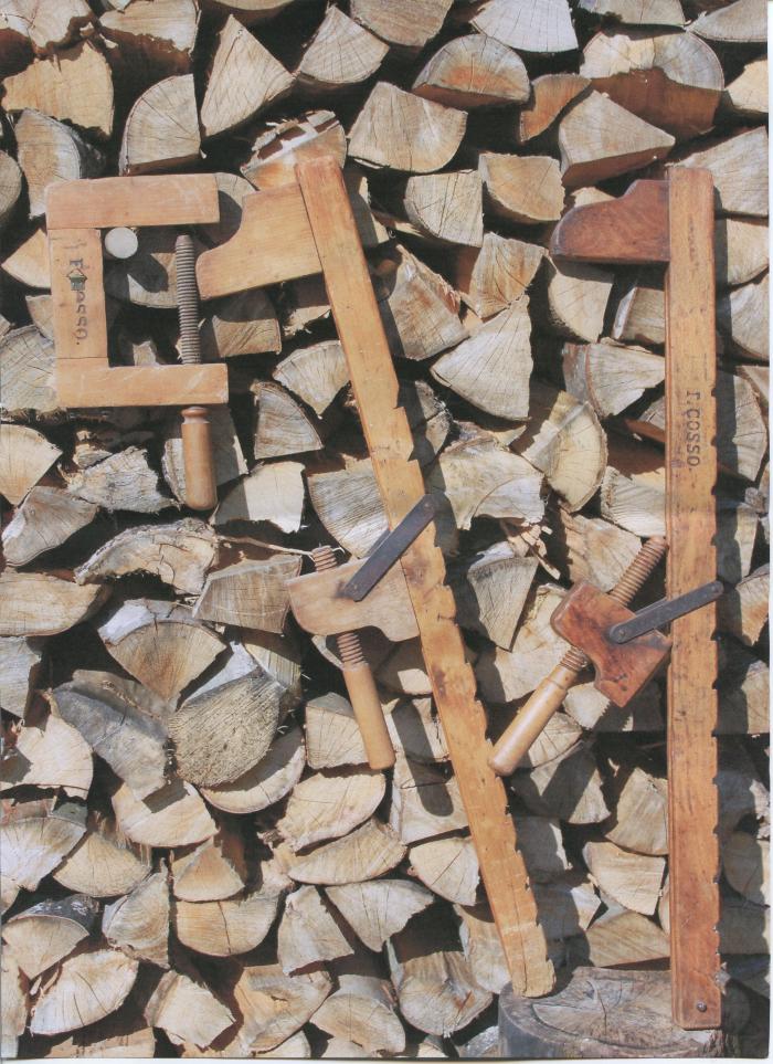 Trois serre-joints en bois dont un petit. Celui-ci et l'un des deux autres portent l'inscription "F. Cosso", propriétaire des outils. L'objet de gauche s'appelle aussi presse. Ils proviennent des Syords à Saint-Jean-de-Tholome.