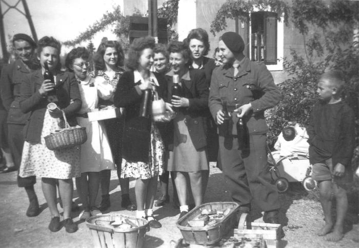 Deux soldats et un groupe de jeunes femmes avec des victuailles à Saint-Julien-en-Genevois