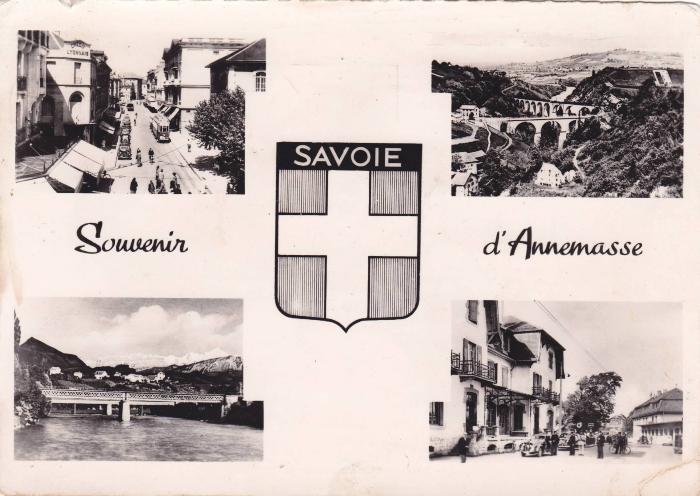 Carte postale en noir et blanc composée de quatre vues d'Annemasse, avec au centre, la croix de Savoie.