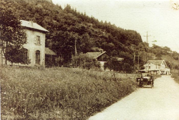 Carte postale sépia présentant l'école de la Corbière à gauche, le restaurant au fond ainsi qu'une ancienne automobile.