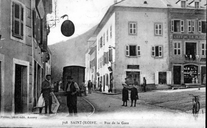 Carte postale ancienne, montrant la rue de la gare à Saint-Jeoire-en-Faucigny. On distingue un wagon sur les rails.
