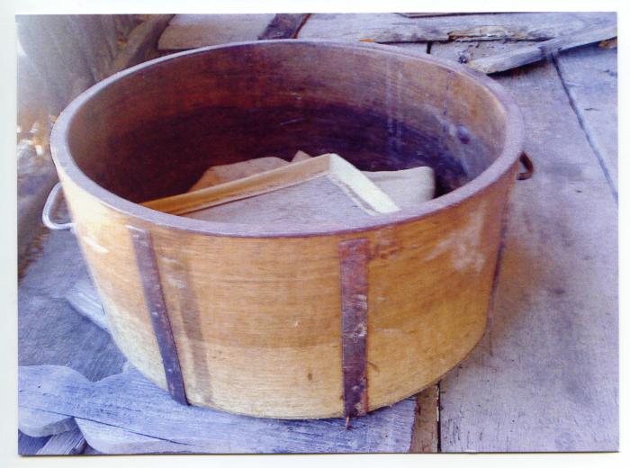 Photographie en couleur représentant une mesure pour l'avoine. Elle date de la fin du XIXème siècle. Elle contient environ 25 litres.