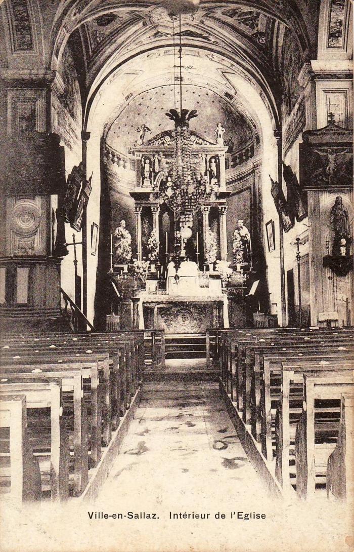 Cette carte postale représente l'intérieur de l'église de Ville-en-Sallaz en 1920. On peut apercevoir le mobilier, les statues et les éléments décoratifs religieux.