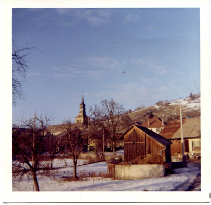 Cette photographie représente une vue générale de la commune de Ville-en-Sallaz sous la neige en janvier 1970. On peut apercevoir en arrière-plan le clocher de l'église.