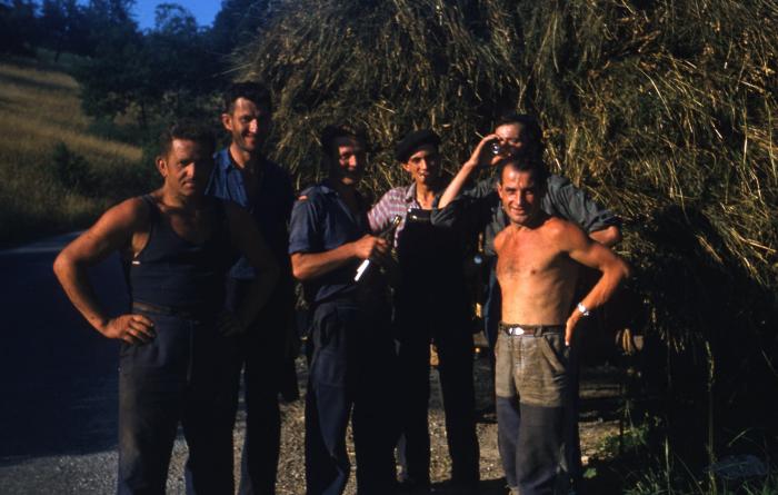Photographie en couleur représentant un groupe de paysan en pause pendant les foins à Viuz-en-Sallaz.