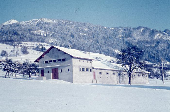 Photographie en couleur représentant la construction de la porcherie de Viuz-en-Sallaz.