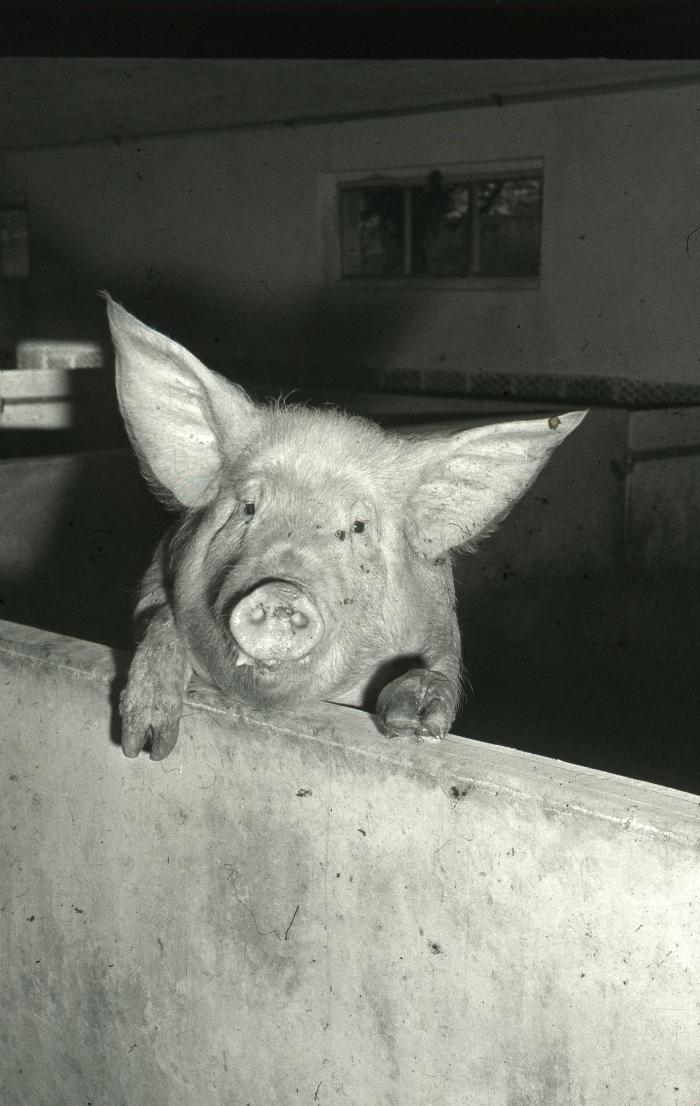 Photographie en noir et blanc de l'intérieur de  la porcherie de Viuz-en-Sallaz. Au premier plan, un jeune cochon.