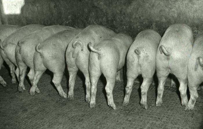 Photographie en noir et blanc de l'intérieur de  la porcherie de Viuz-en-Sallaz. Au premier plan, une rangée de cochons vus de dos.