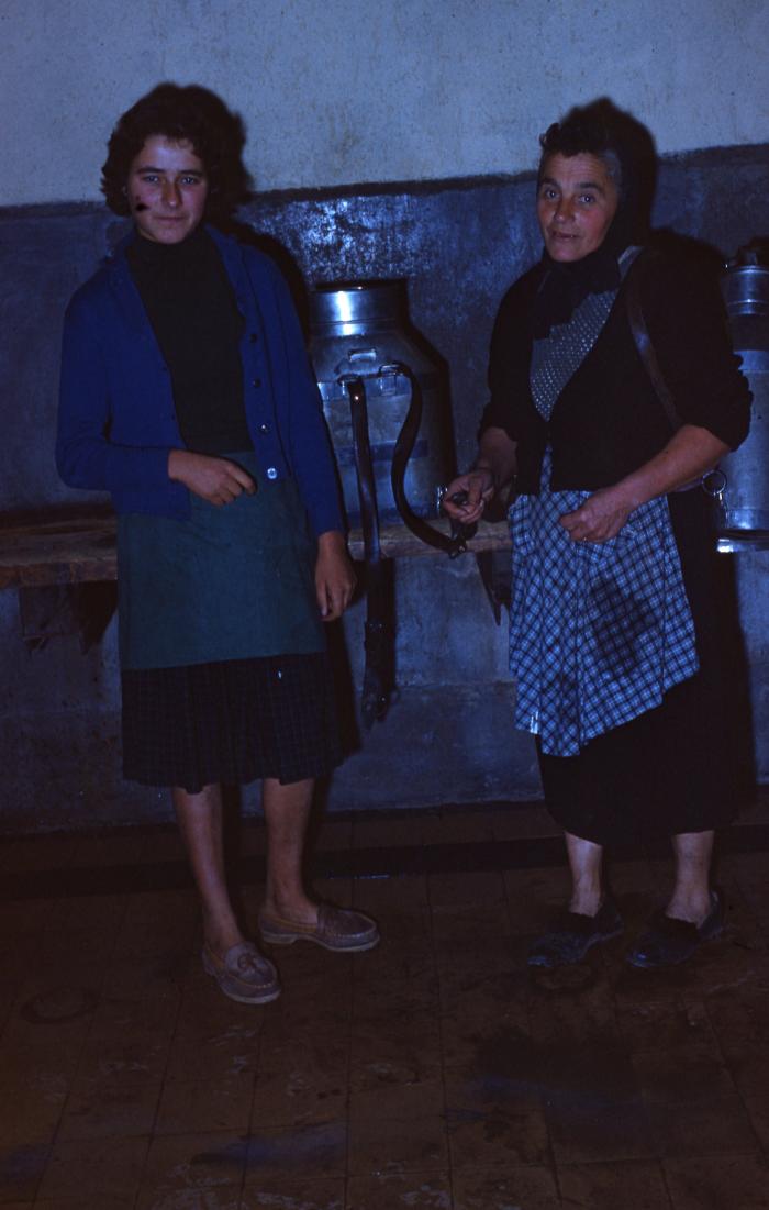 Photographie en couleur représentant le dépôt de lait à la fruitière de Viuz-en-Sallaz par les sociétaires.