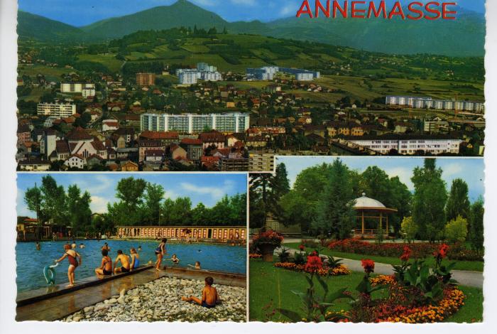 Carte multi vues présentant divers éléments représentatifs de la ville d'Annemasse dans les années 1970. Dans le bandeau supérieur une vue panoramique d'Annemasse dont l'église Saint Joseph ainsi que le Môle et le Mont Blanc. Dans le bandeau inférieur, à gauche, la piscine du Pont d'Etrembières aujourd'hui démolie. Dans le bandeau inférieur, à droite, le kiosque Marius David construit en 1931 dans le parc municipal Claudius Montessuit.