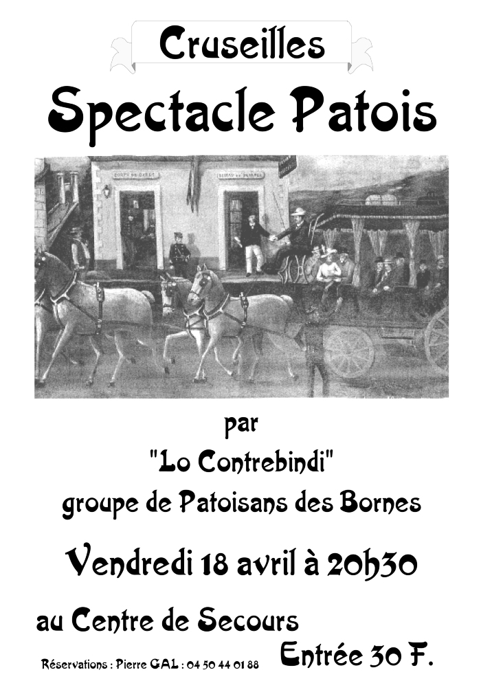 1- Affiche spectacle patois par Lo Contrebindi – groupe de Patoisants des Bornes, le vendredi 18 avril 1997 à Cruseilles.